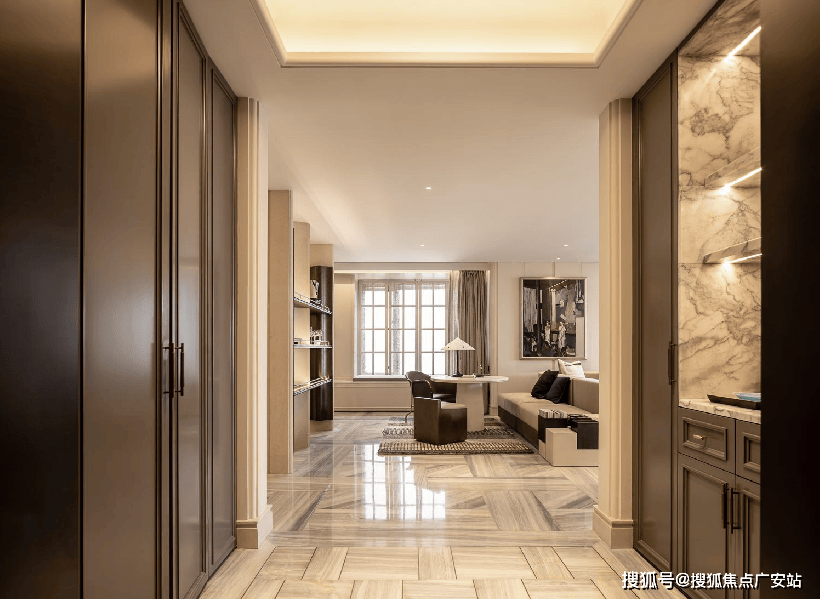 进入室内的入户玄关收纳空间,地面采用静雅棕、宝格丽兰石材拼花设想,古典回形波打+实心铜条的搭配加强入户卑贱感。左侧是山川白奢石的格,左侧是行李间,通过暗门的做法,将功能连系进去,强化了归家的典礼感。