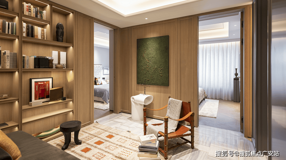 行政从卧套房空间,空间包含双开门+玄关+男女双衣帽间+迷你吧+卫生间+打扮台书房,面积50余平,这种标准感和舒服感正在市道上很是少见。